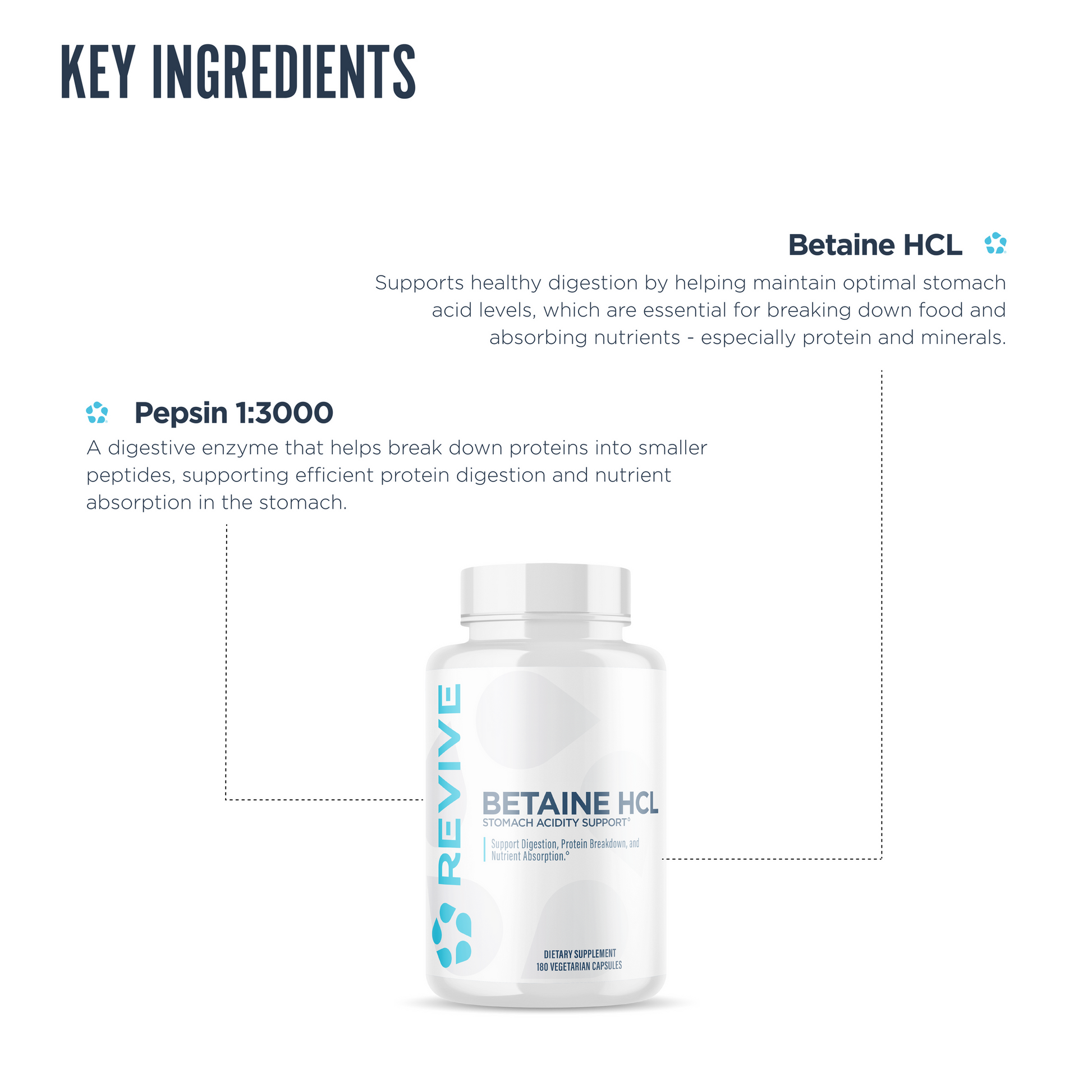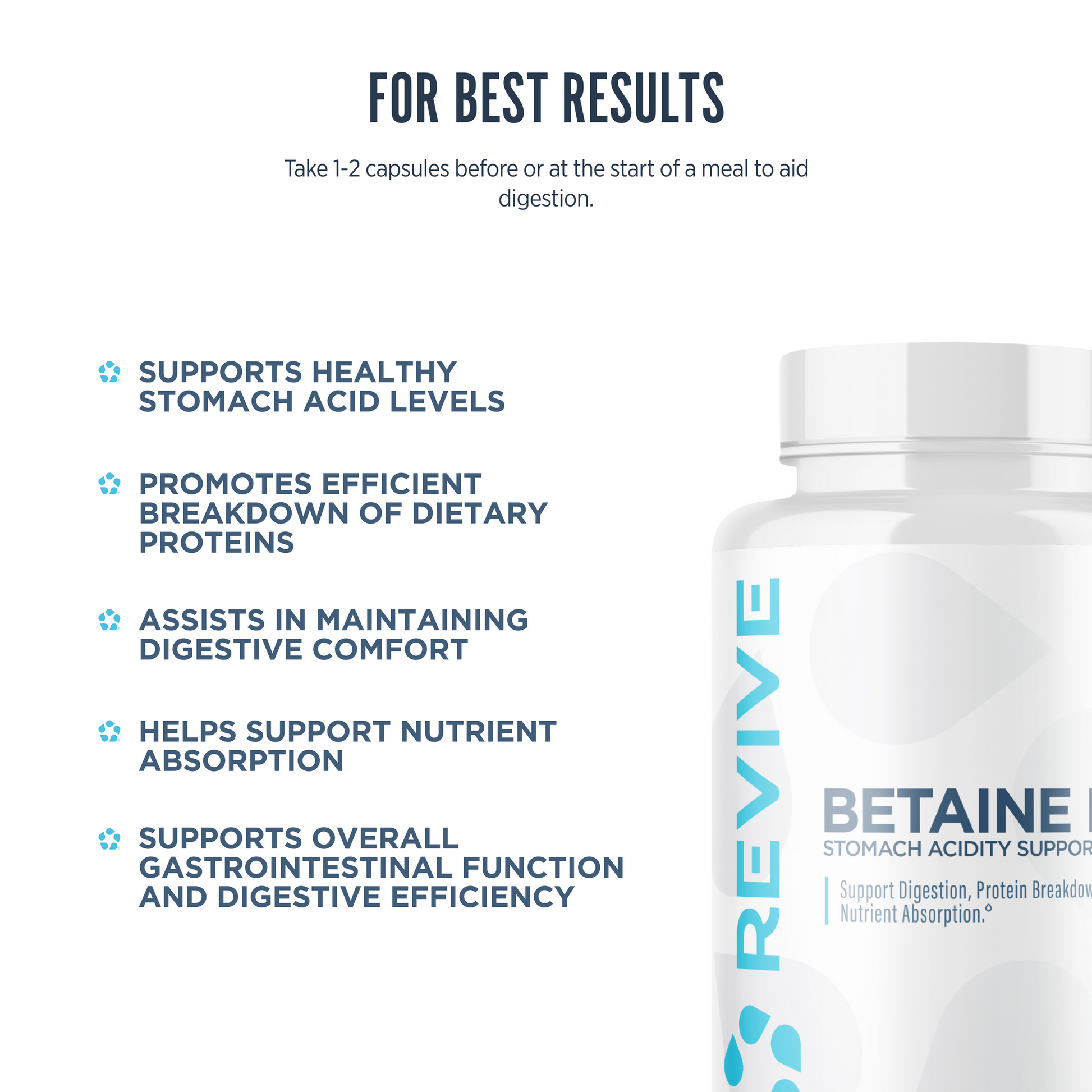 مكملات ريفايف، بيتاين هيدروكلوريد، هو مُساعد طبيعي للهضم، مُصمم لدعم الهضم الصحي وامتصاص العناصر الغذائية. بيتاين هيدروكلوريد هو مُركب طبيعي موجود في البنجر وخضراوات أخرى، ويُعرف بقدرته على زيادة مستويات حموضة المعدة.